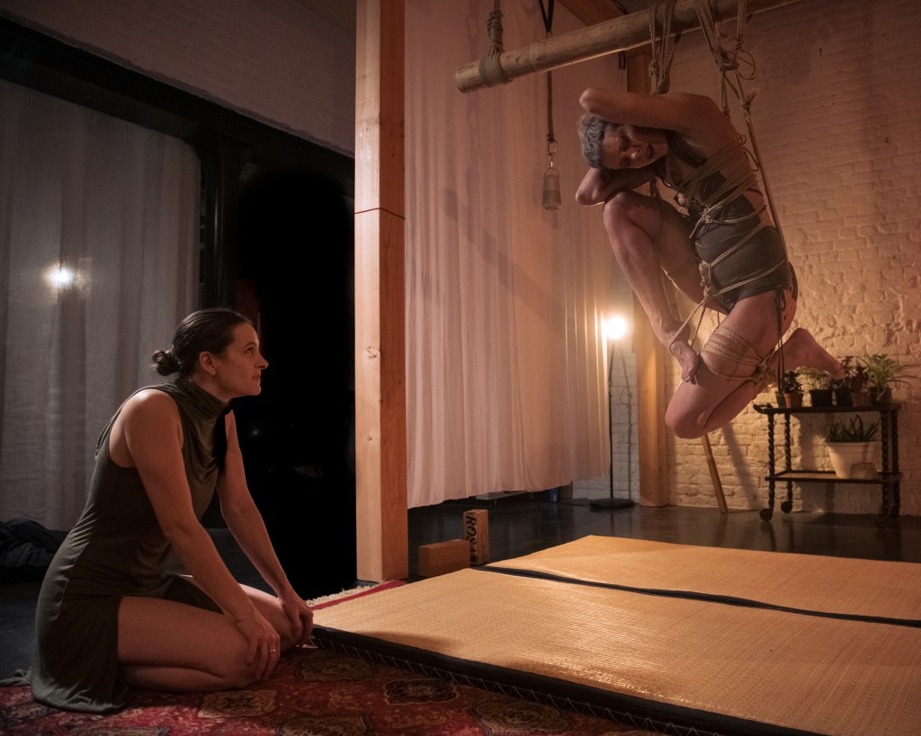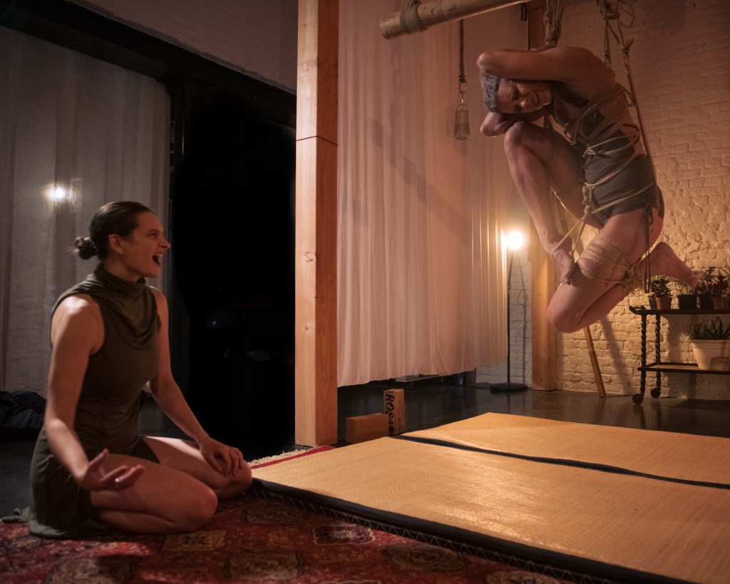 Years ago in Montana, I had the very inspiring opportunity to work with a performance artist who came up with the concept of the “primordial hum” – a call and response exercise starting with quiet gentle sounds hummed back and forth between people that ends in a rush of guttural screams. We are very thankful to the audience for lending their attention and voices to the performance as we conducted our own hum experience while Lee gutted out a tough vertical suspension.