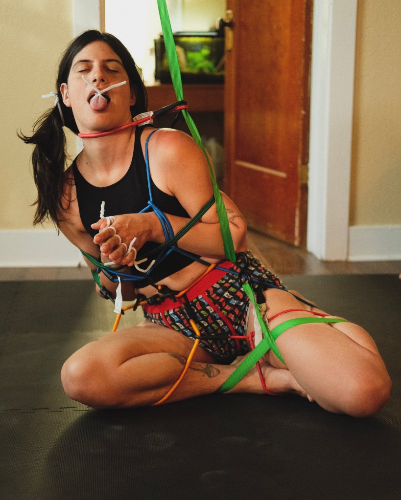 If you, seeing this, would like to try the same – there are some details which are important to consider. One, that you must find a way to break the tension in the line from the thumbs to the rest of the harness. Two, that your bottom has the ability and body-knowledge to sense when they are having nerve problems without the ability to do the thumbs up test or raise their wrists. And three, that you do not tie yourself into a corner without the ability to untie the fingers quickly.