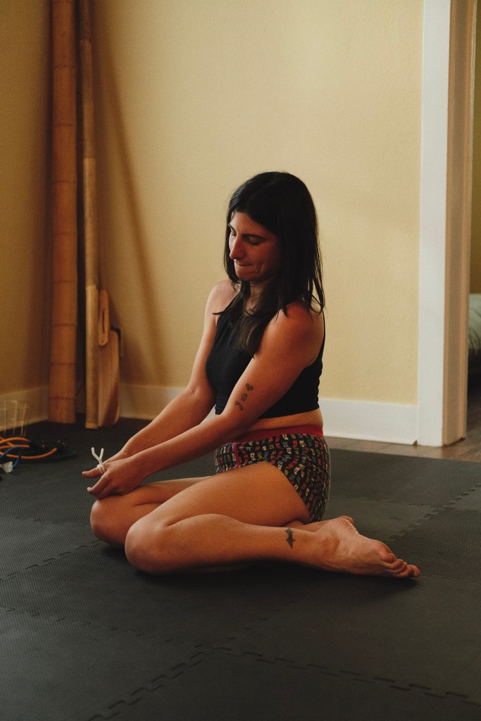 As we made our way to the ground I felt there was an opportunity to play in a partial. I used the rope from the blindfold to pull Jersey into a back bend. Though it is not the most dramatic shape, when someone follows the pull of the rope with their neck instead of their middle back, the position becomes intense very quickly. Their breathing becomes impaired and you will need to watch carefully to ensure it doesn’t become too much. We lingered here for a few long breaths and then came down – first by releasing the neck, then the feet, then the chest.
