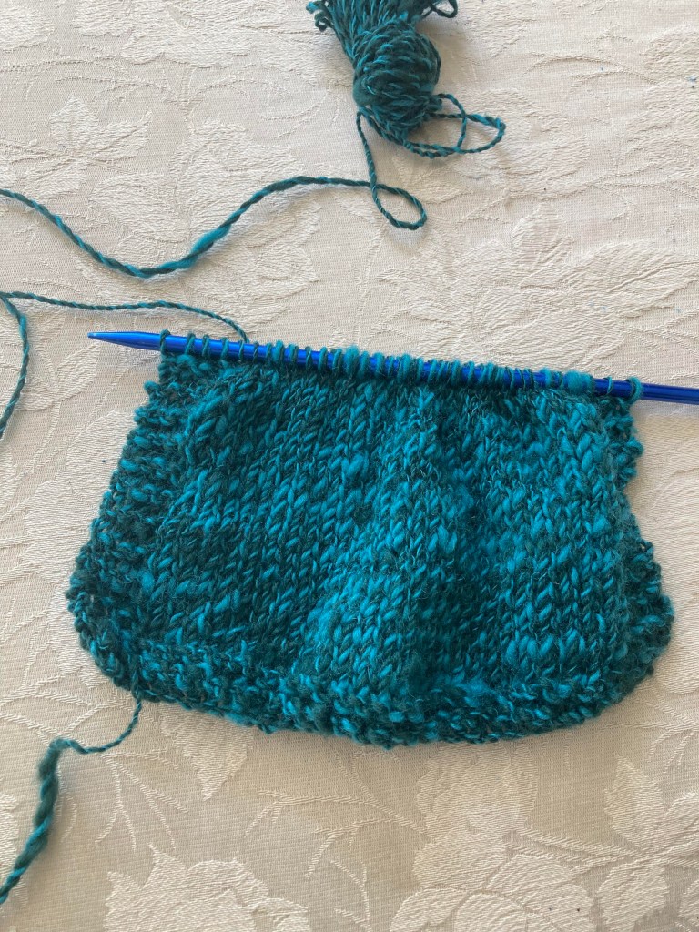 The finished object tells its own story of growing experience. My first yarn was horribly inconsistent, and my first few rows of knitting with it were stilted and uncertain. I made up a simple pattern using half remembered stitches from a knitting lesson I am sure my grandmother gave me when I was about 11, and much more helpfully, some Youtube tutorials. The strands are very gently thick and thin, some sections of fabric bulky and dense, while others dip into a lacey lightness as the yarn thins out. Somewhere in the midpoint I picked up a stitch, so one side is slightly wider than the other. Still, at the end is a perfectly wearable neck warmer – made in the traditional way, from local materials.